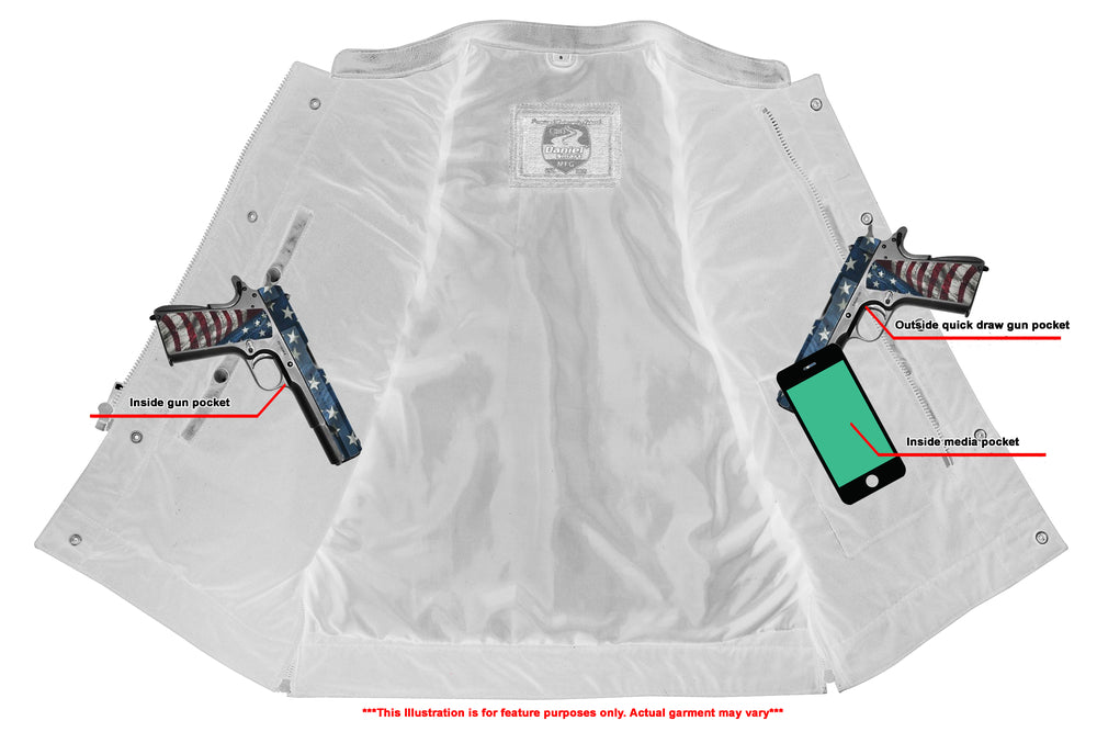2 upgraded style concealed gun pockets between the snap and the zipper made of special heavy-duty textile with built-in holsters and snap closure.
