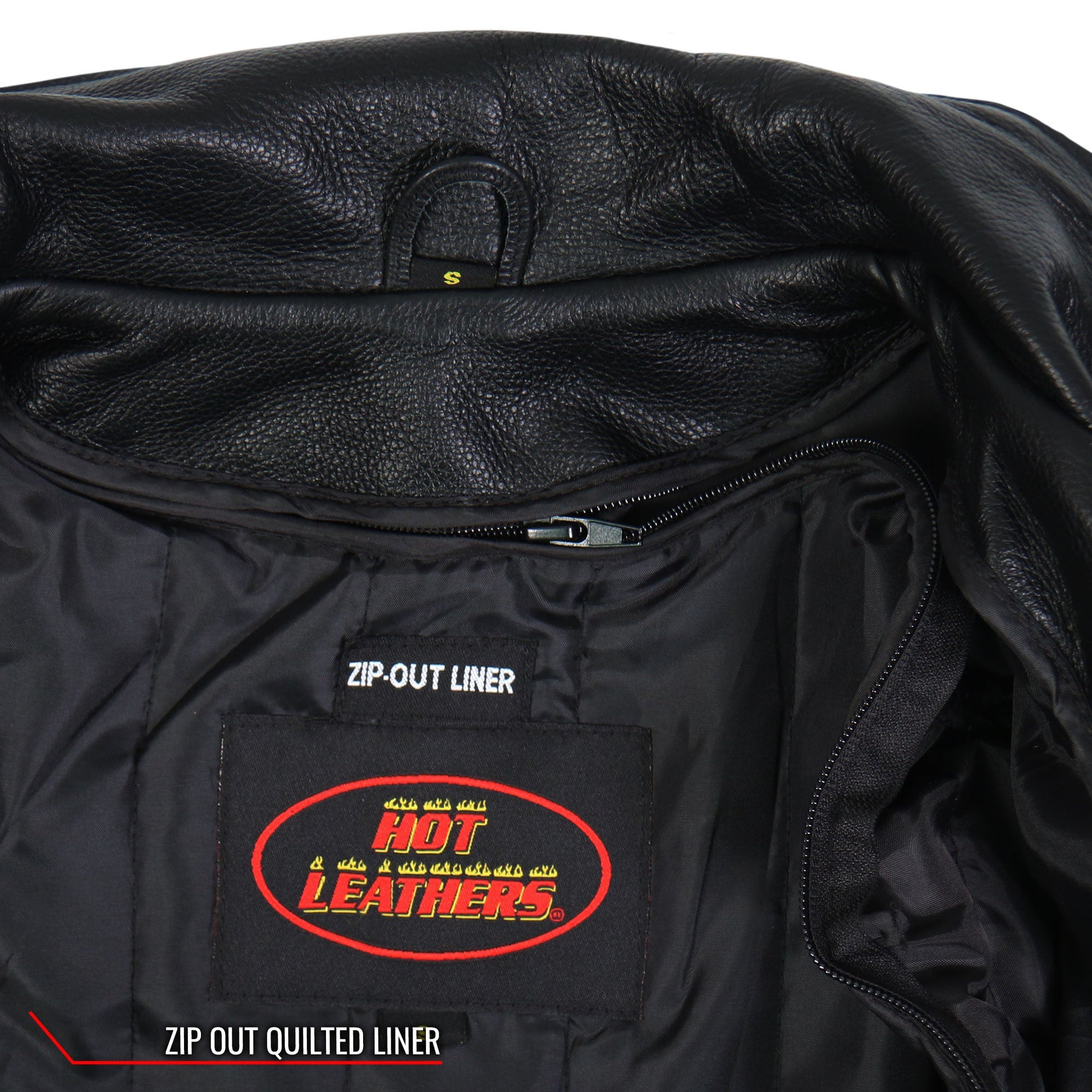 Great updated version of the classic leather motorcycle jacket. This Ladies Hot Leathers motorcycle jacket is built using medium weight cowhide & features silver YKK zippers & snaps. This jacket has a braided detail on the front and braid & studs on the back. It also features 2 front zipper pockets, 2 inside pockets, lace up sides & a quilted zip out lining.