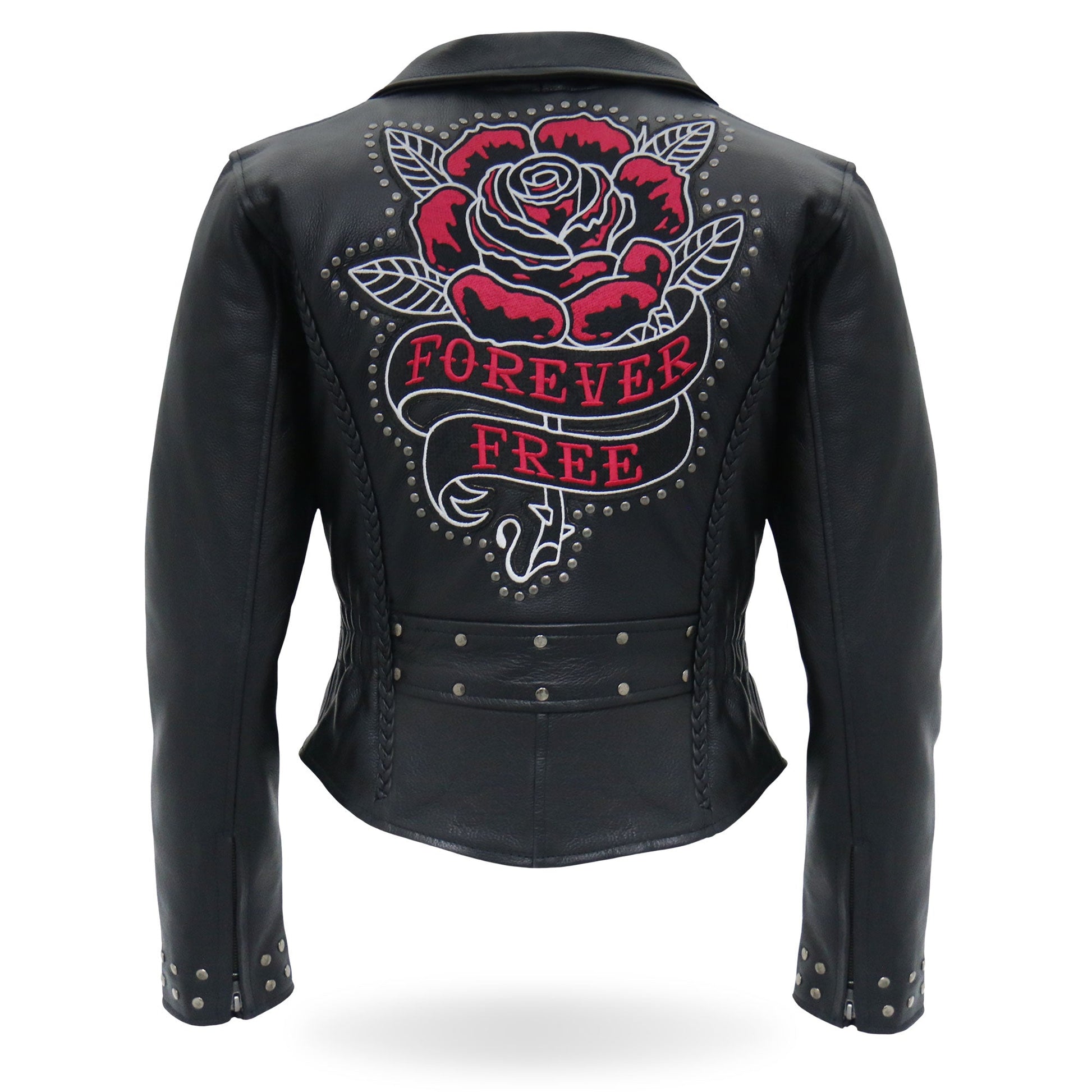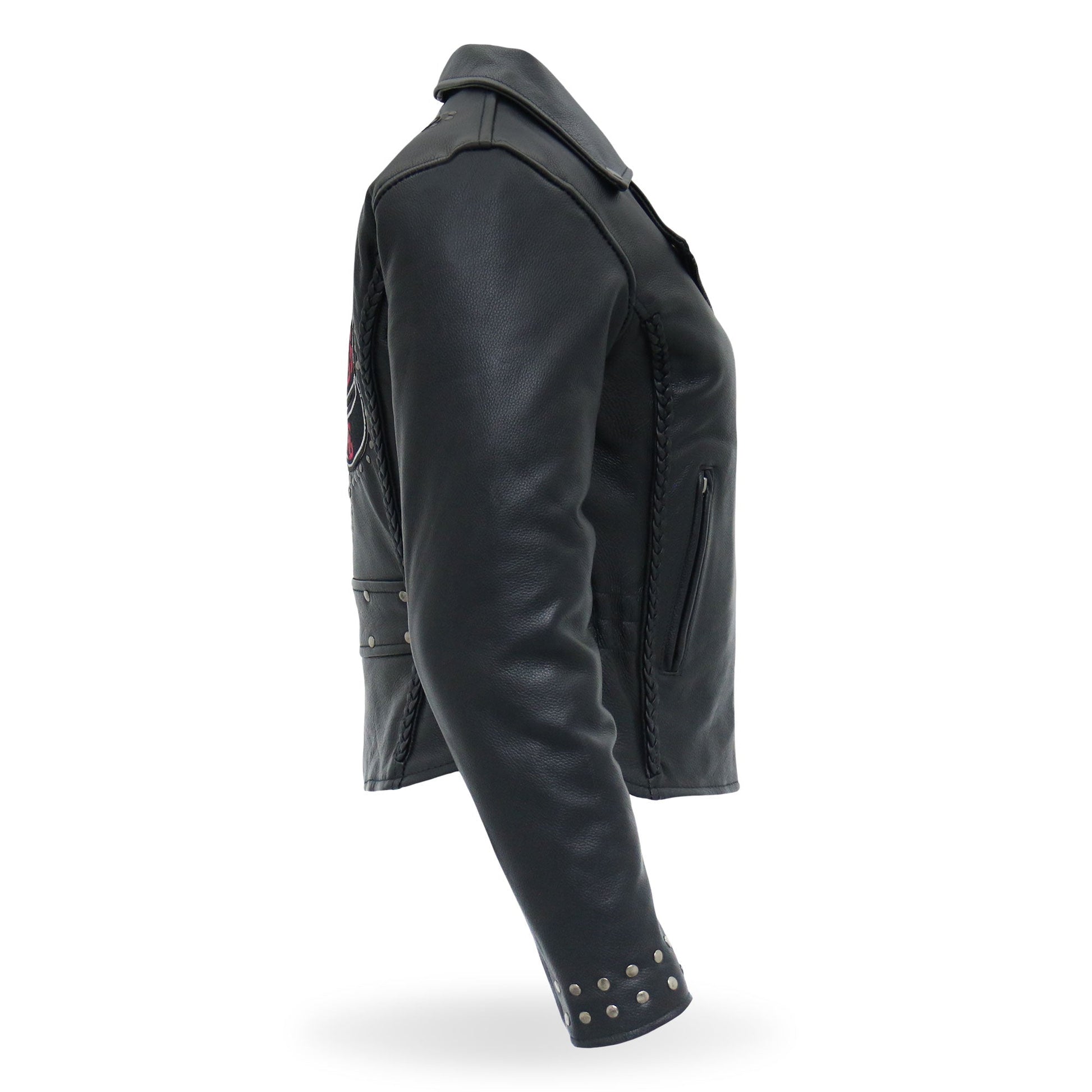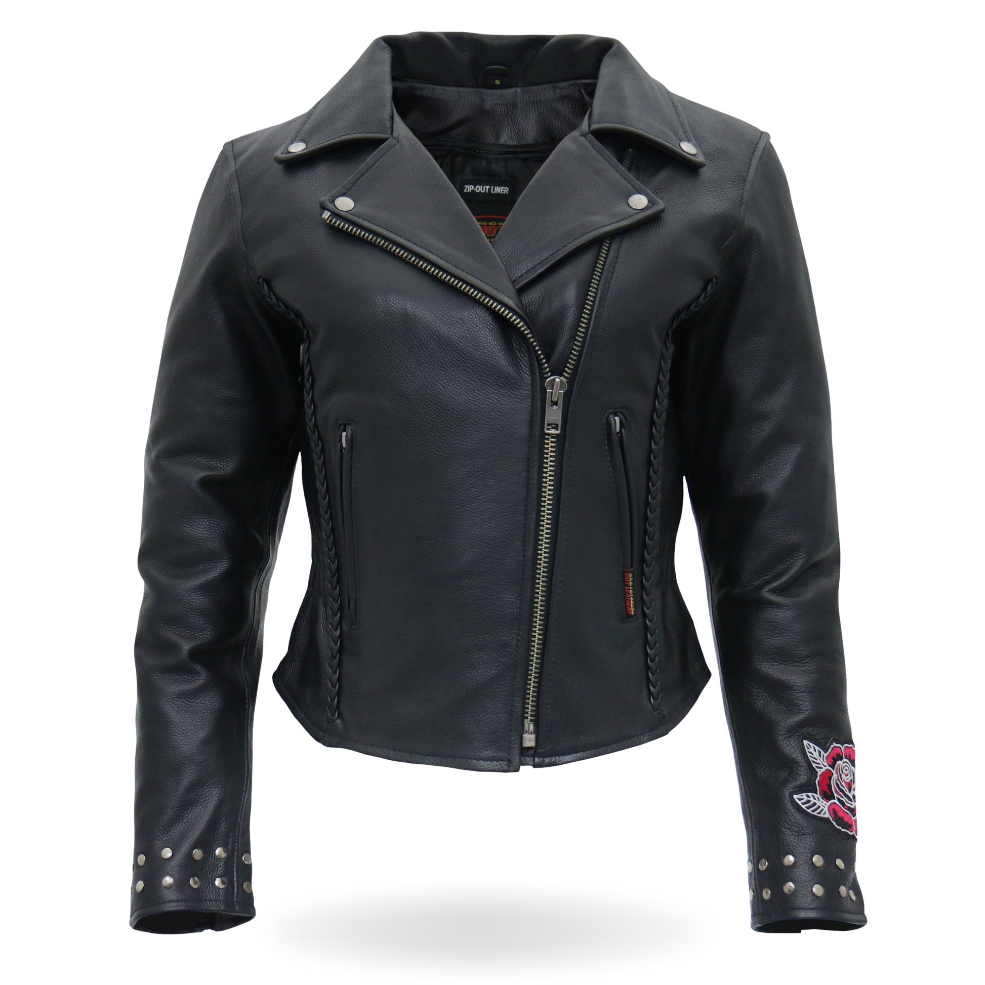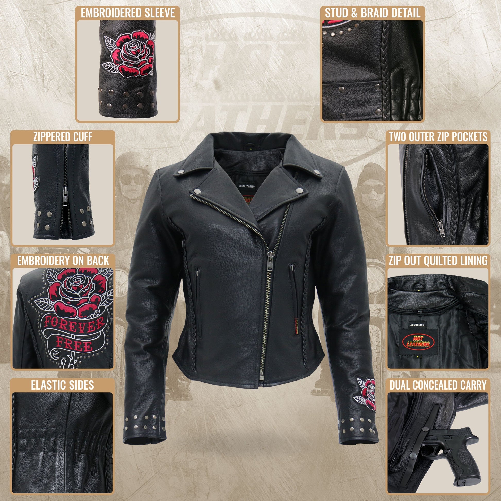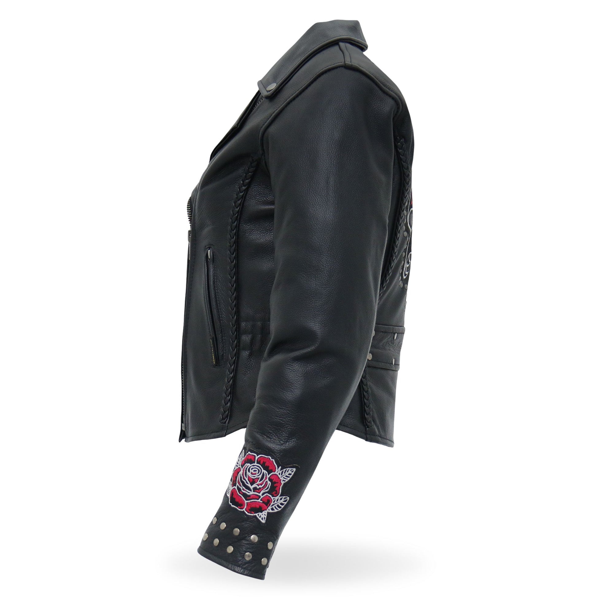 Hot Leathers JKL2001 Ladies Black Braided Motorcycle Leather Biker Jacket with Embroidered Bling Rose Design