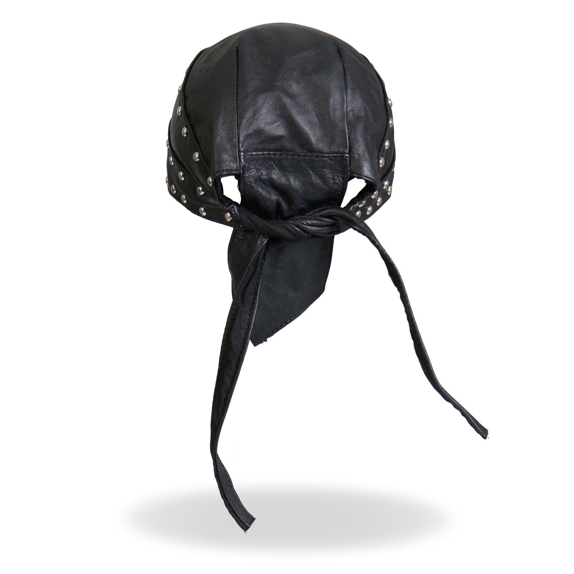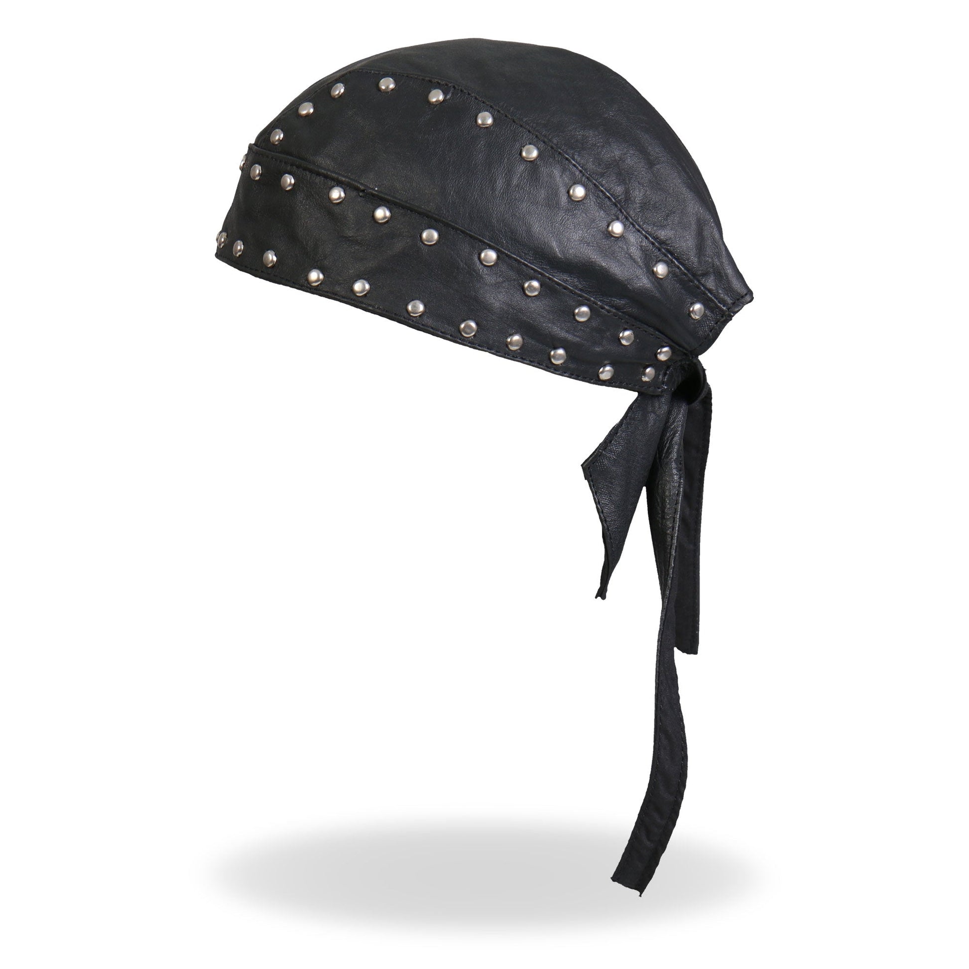 Whether you're hitting the road for a joyride on your motorcycle, getting together with your club, or just need some UV protection and sweat control, Hot Leathers premium doo rag head wraps are just what you need! Put on your new headwrap bandana while you run errands or handle some yard work. Represent your unique style with our moisture wicking, lined head wraps, showcasing bright, long lasting designs sure to turn heads! This head wrap features our original solid black leather and metal stud design.