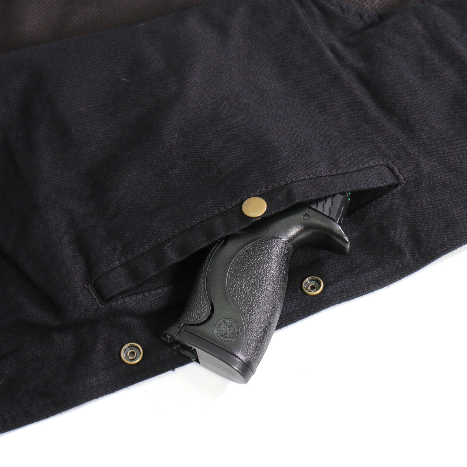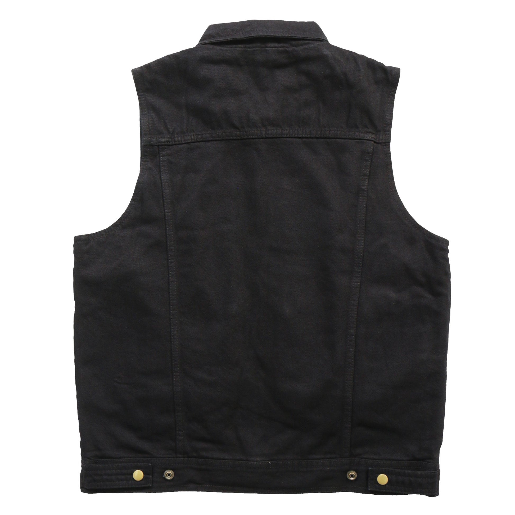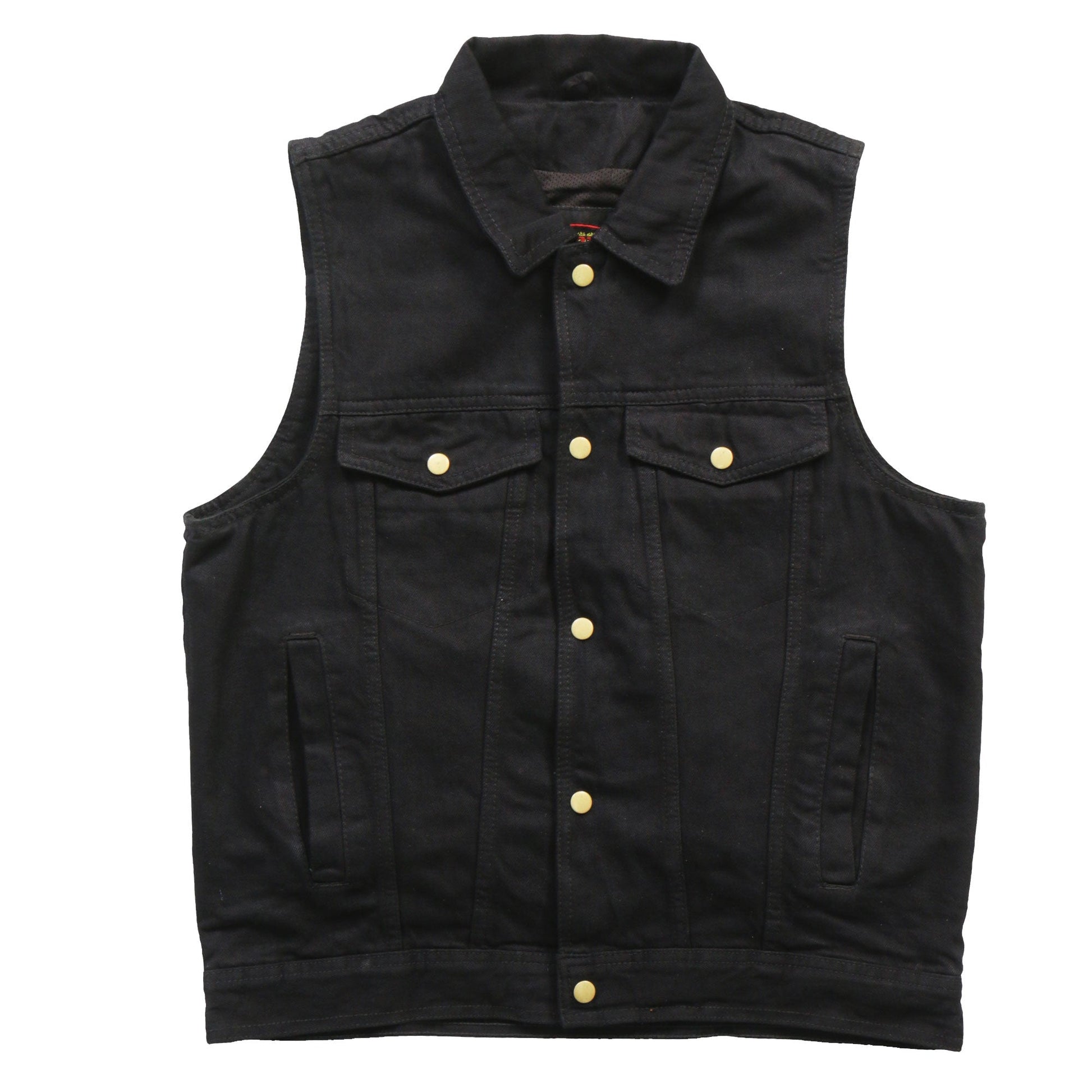 Classic Mens Denim Sleeveless Vest. This Hot Leathers denim motorcycle vest is built using heavyweight denim and black hardware. A great feature on this vest is the snap down collar which makes for a great fit over your Hot Leathers flannel or hoody. There are two snap front upper pockets, two lower slash pockets and two deep carry conceal inside pockets. The lining is denim and mesh. There is plenty of space to sew your favorite Hot Leathers patches on this vest. This leather vest comes with a 90 day warranty.