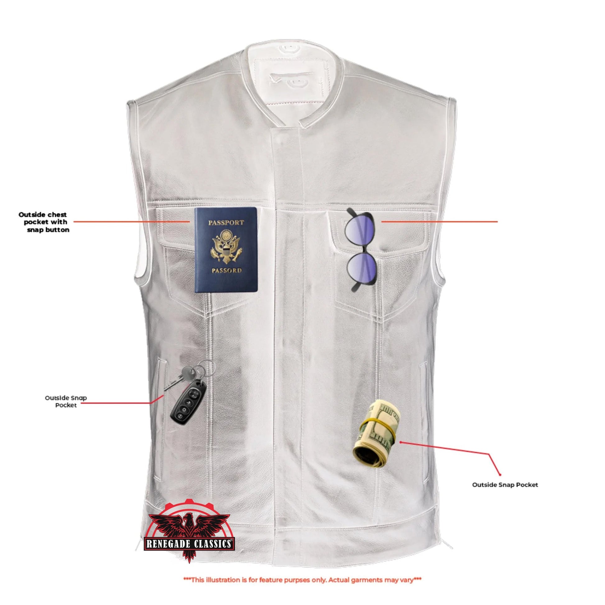 Leather vests offer mobility and security for those who carry guns on the road. Our men's gun pocket vest with bottom side zippers is perfect for bikers who want to conceal carry on or off their bike. Our vests are made of soft, premium drum-dyed milled naked cowhide 1.2 - 1.3mm for comfort and durability.