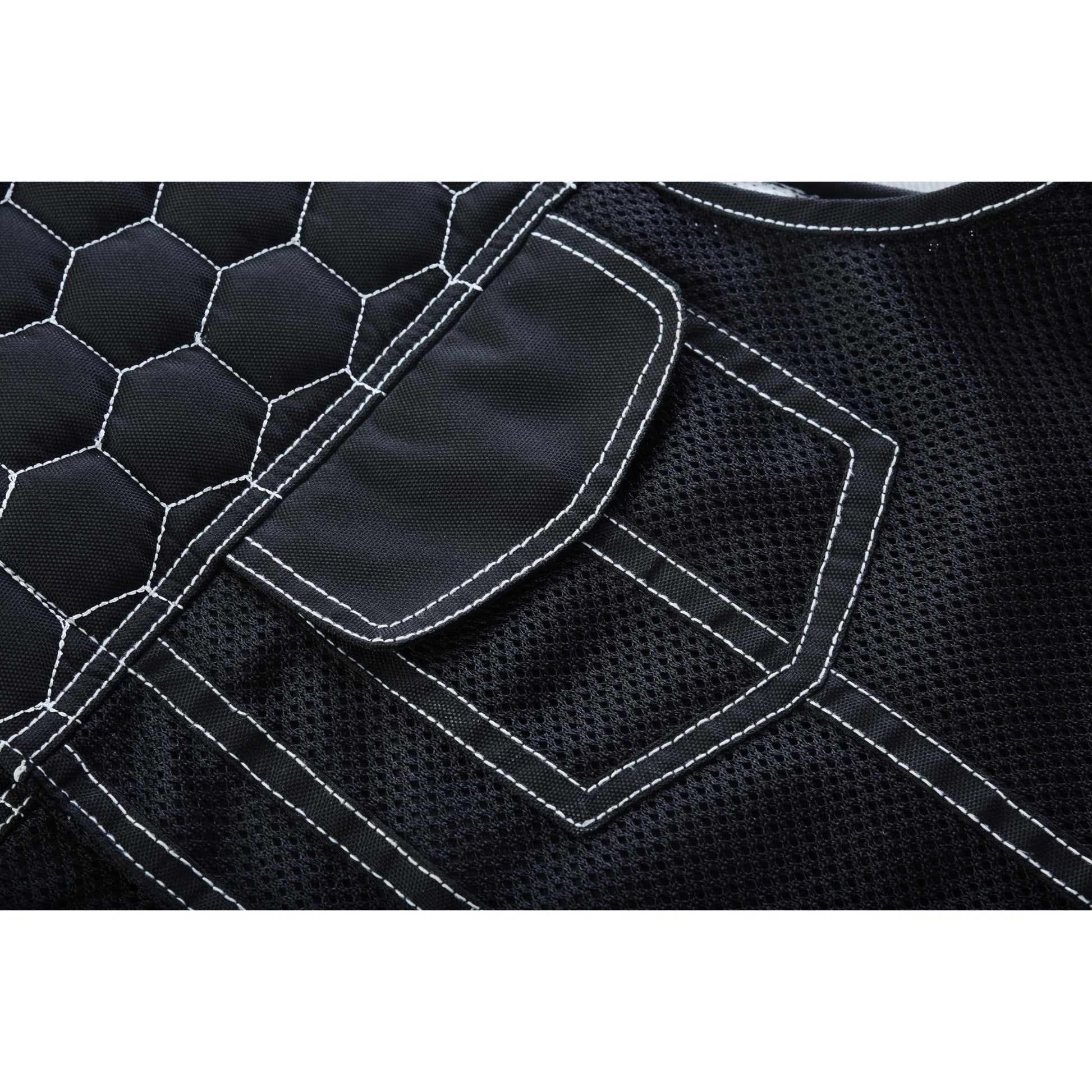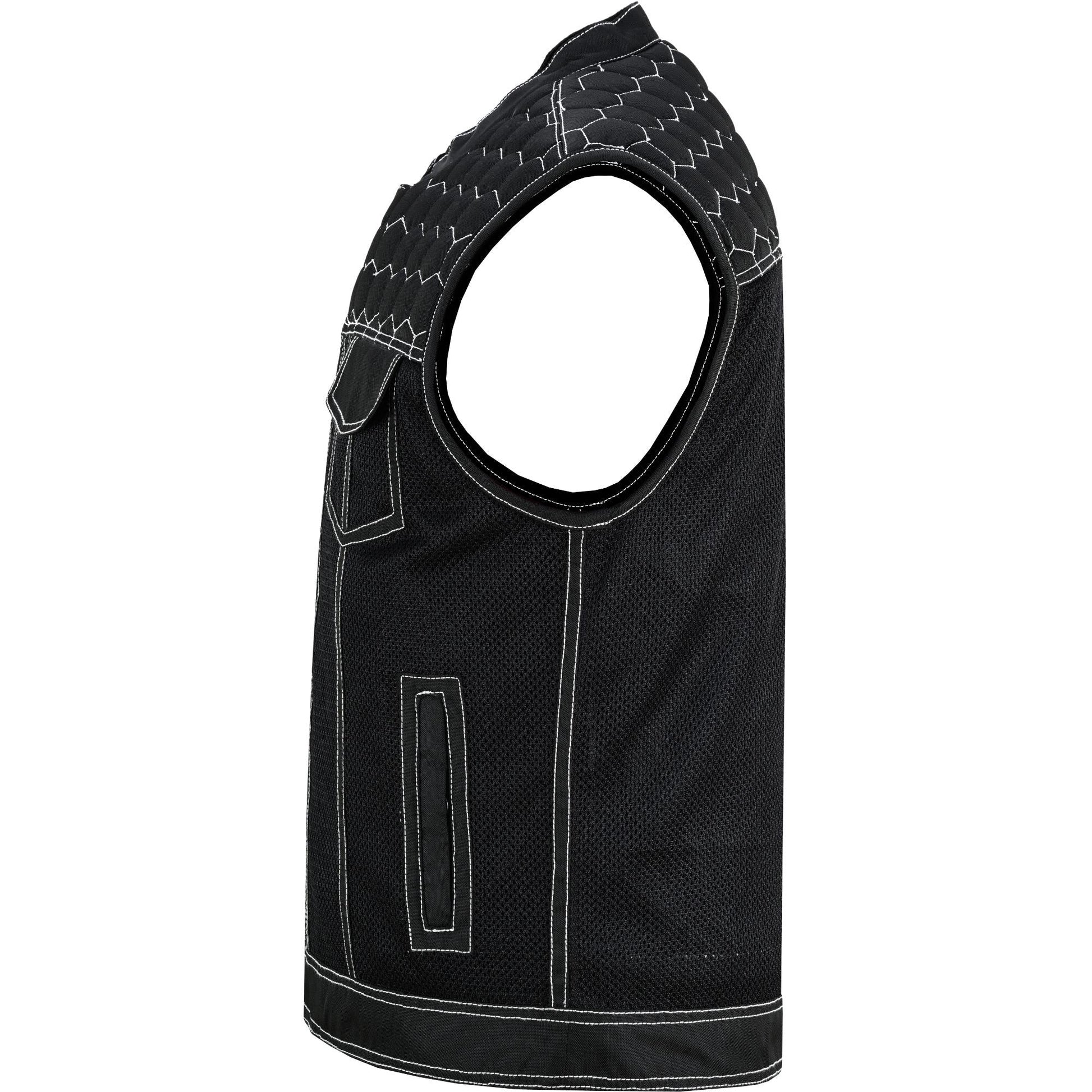 Our Dark Striker Black Mesh Textile Vest features a durable mesh construction with vibrant black accents. It includes concealed carry and secure chest pockets with snap button closures for convenience. The hidden front zipper with snap-placket reinforced stitching and built-in hanging loop adds to its practicality and style. This vest is perfect for those who want a striking, functional Vest to match their riding styles.