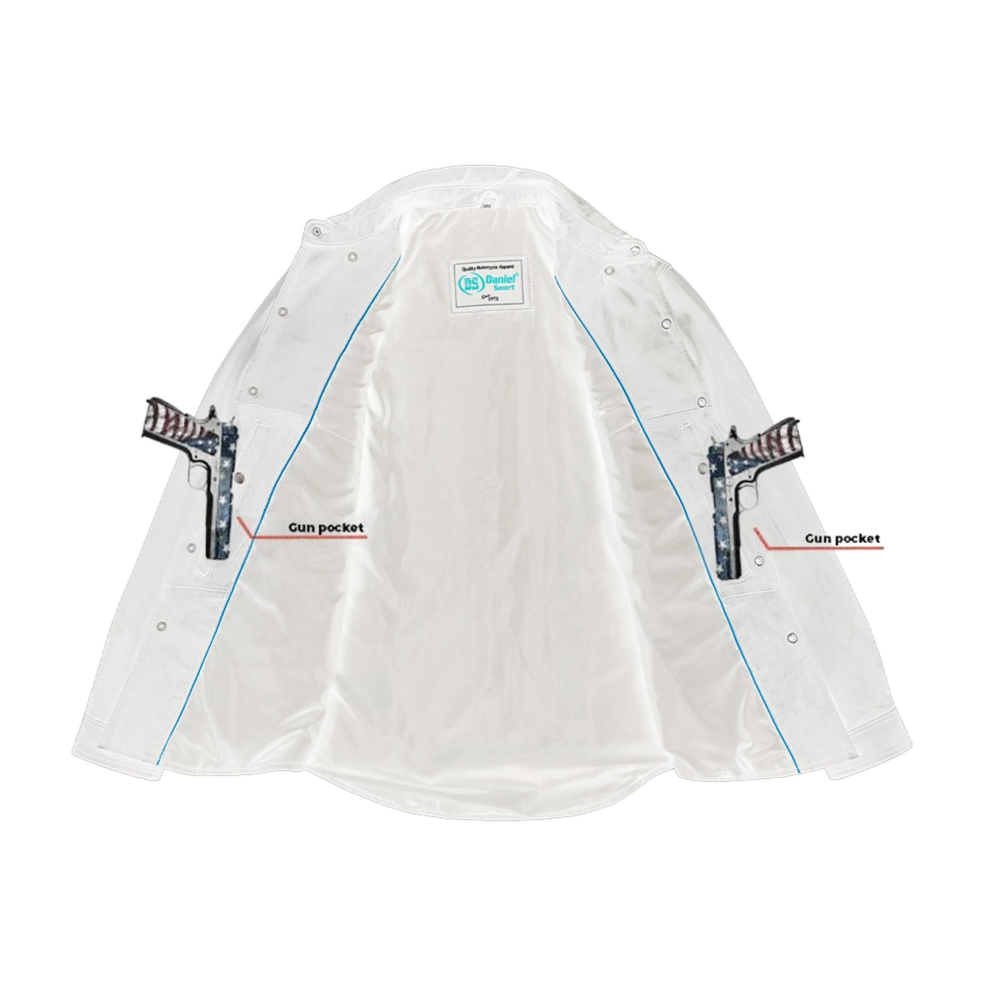 2 inside concealed gun pockets made of special heavy duty textile with built-in holsters and snap closure.