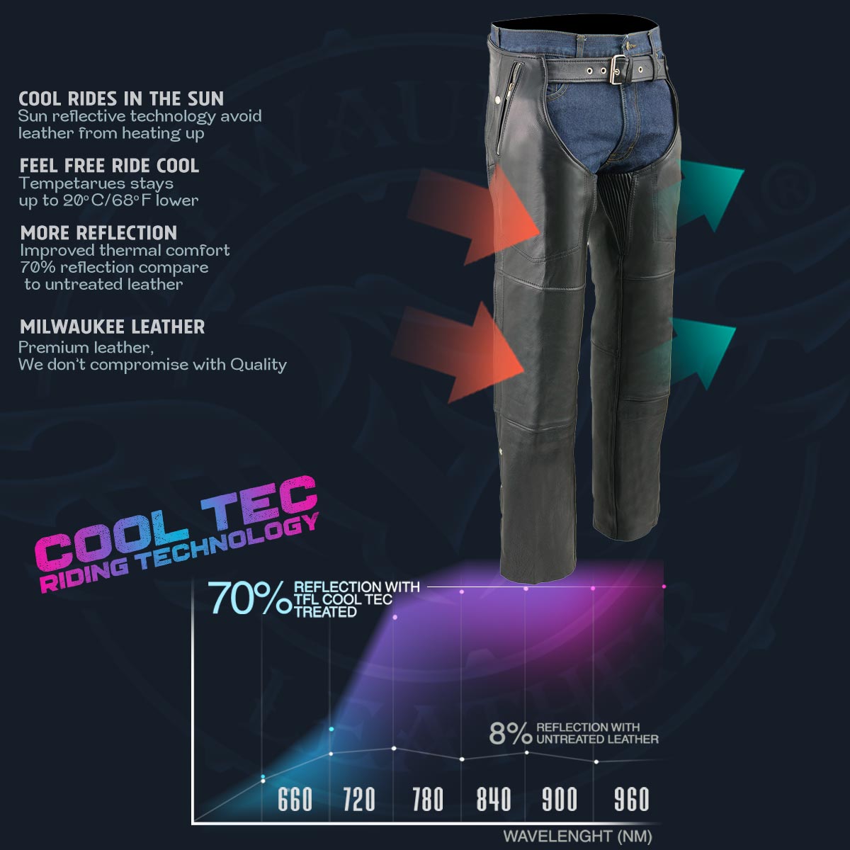 Milwaukee Leather Men’s Motorcycle Chaps Black Cool-Tec Premium Leather with Snap Removable Thermal Liner MLM5505