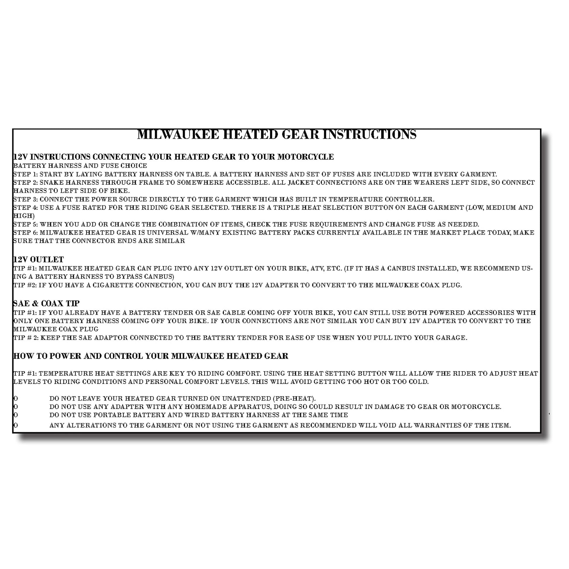 - POWER ON by Connecting to your Motorcycle’s Battery with the Included Battery Wire Harness or if You own a Milwaukee Leather Heated Jacket, You Can Connect It to the Battery Pack
