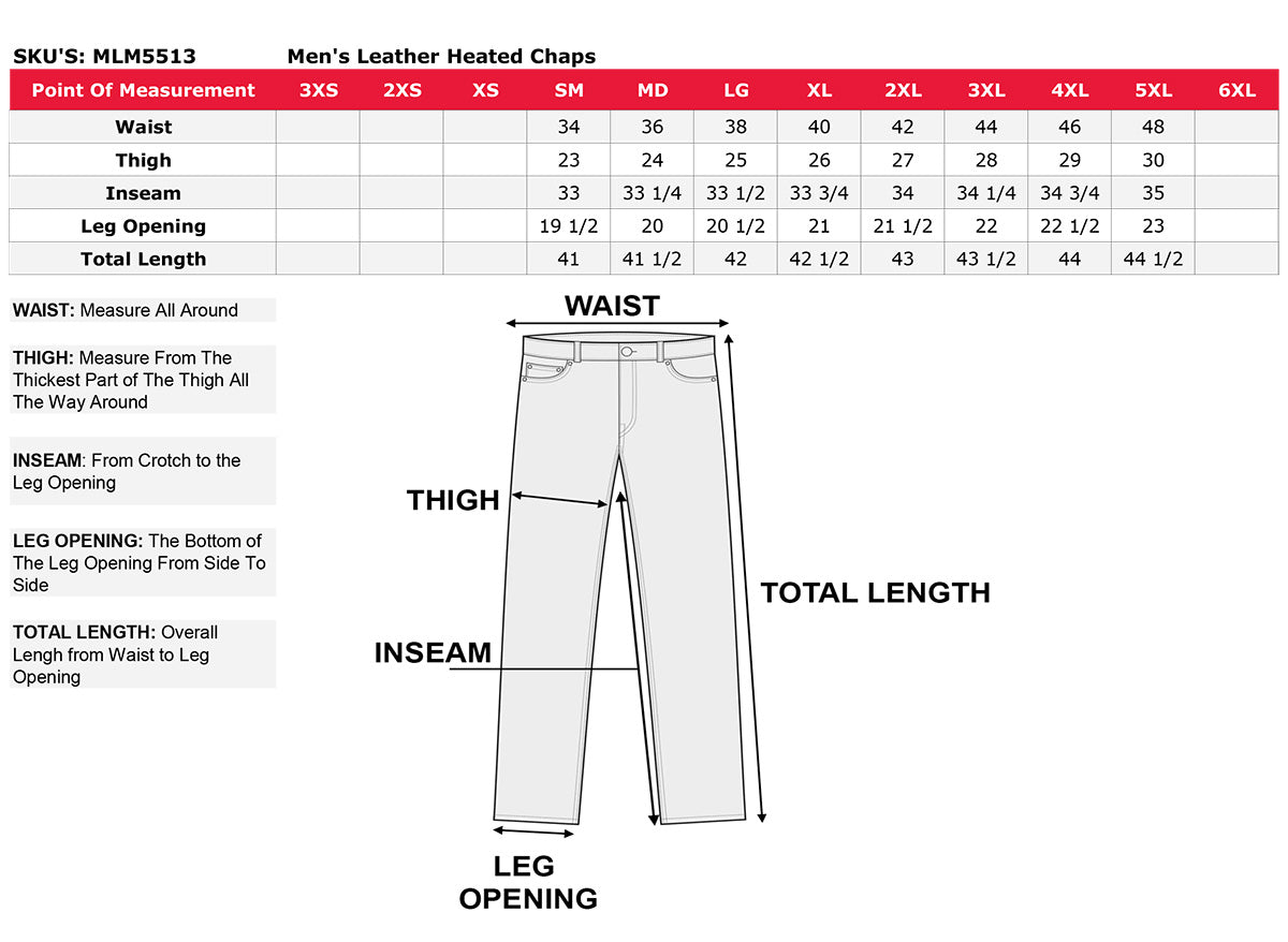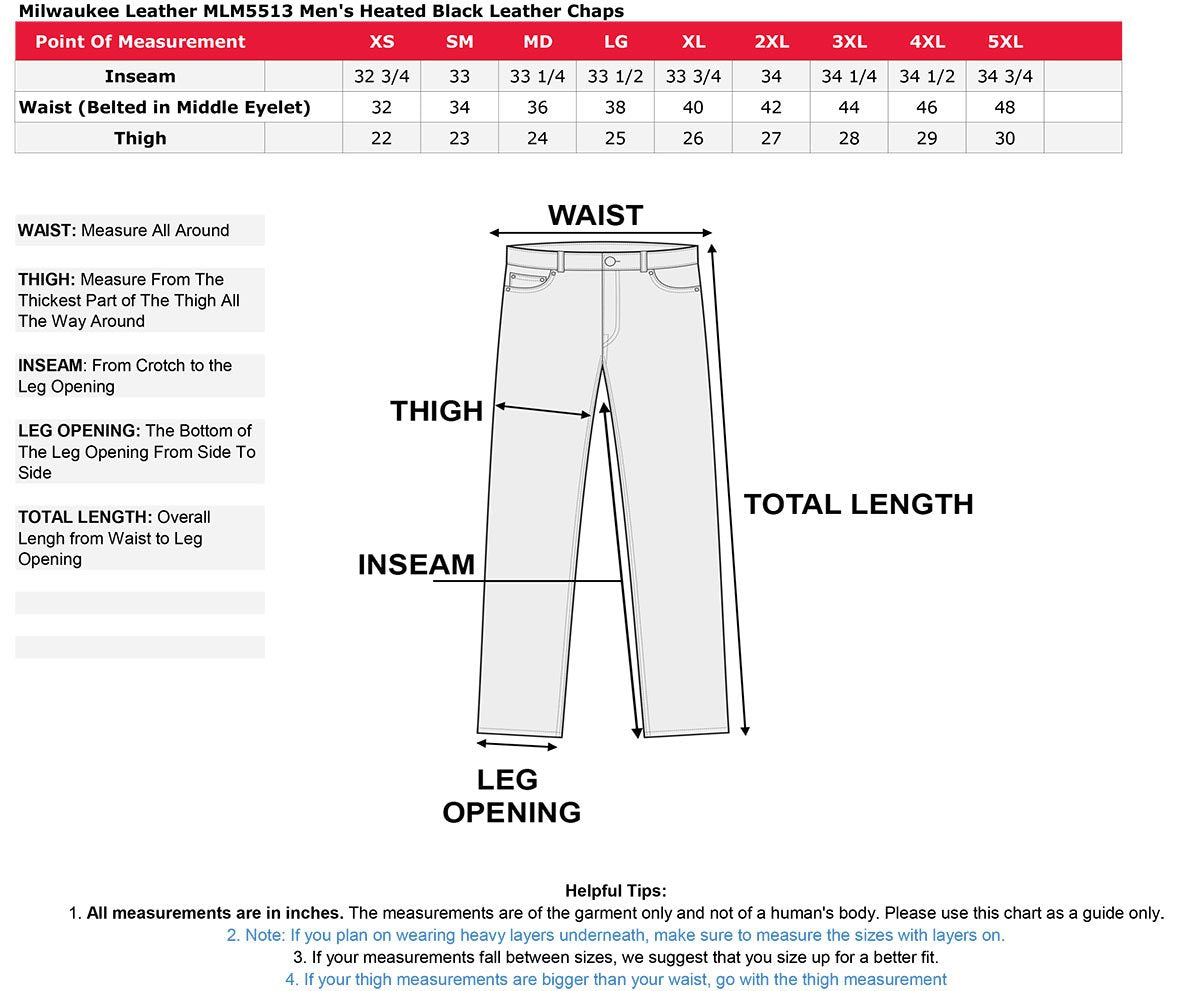 The Milwaukee Leather Men's Heated Leather Chaps Is the Ultimate in Heating Technology Designed for Riders Who Want to Enjoy Heat Either on Or Off the Motorcycle. Made of Premium Naked Cowhide 1.2-1.3mm, Combined with Heating Panels Intricately Placed to Deliver Plenty of Heat Where You Need It.