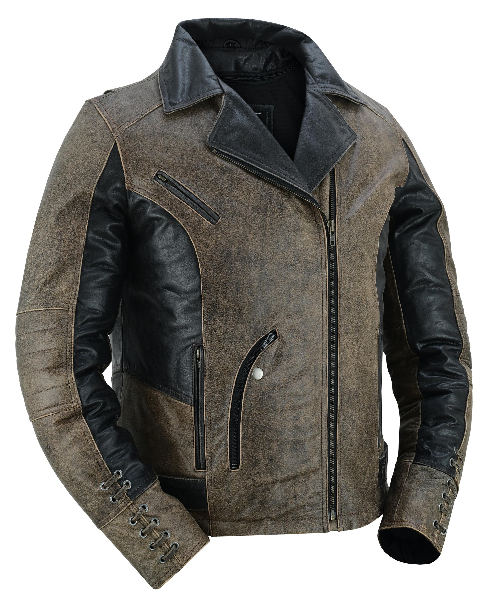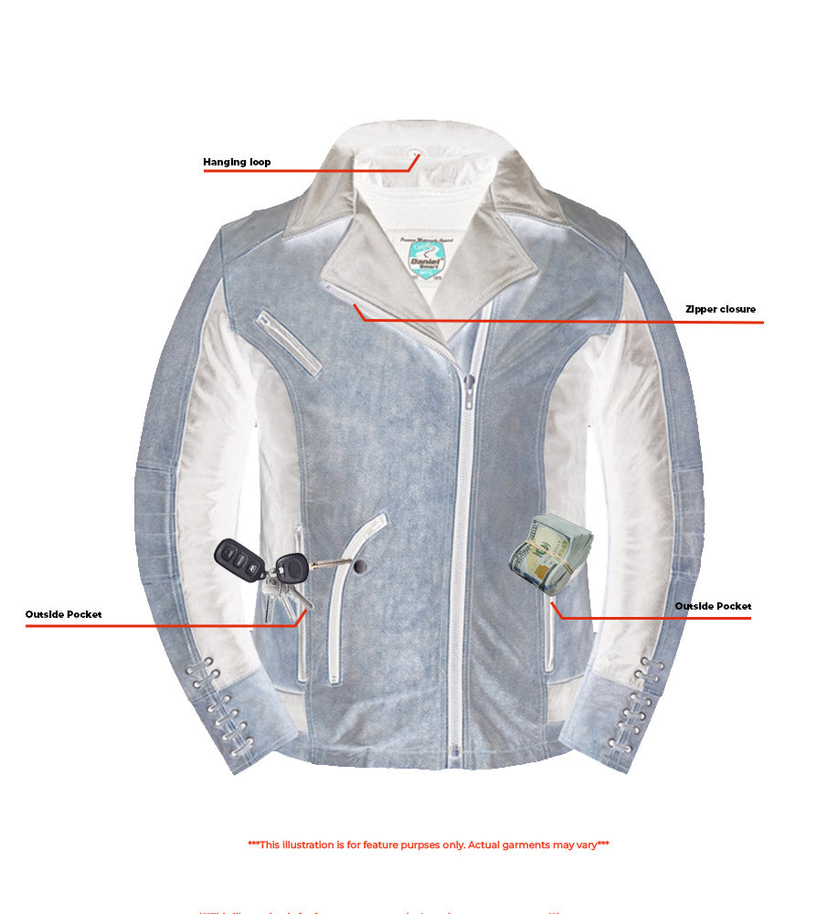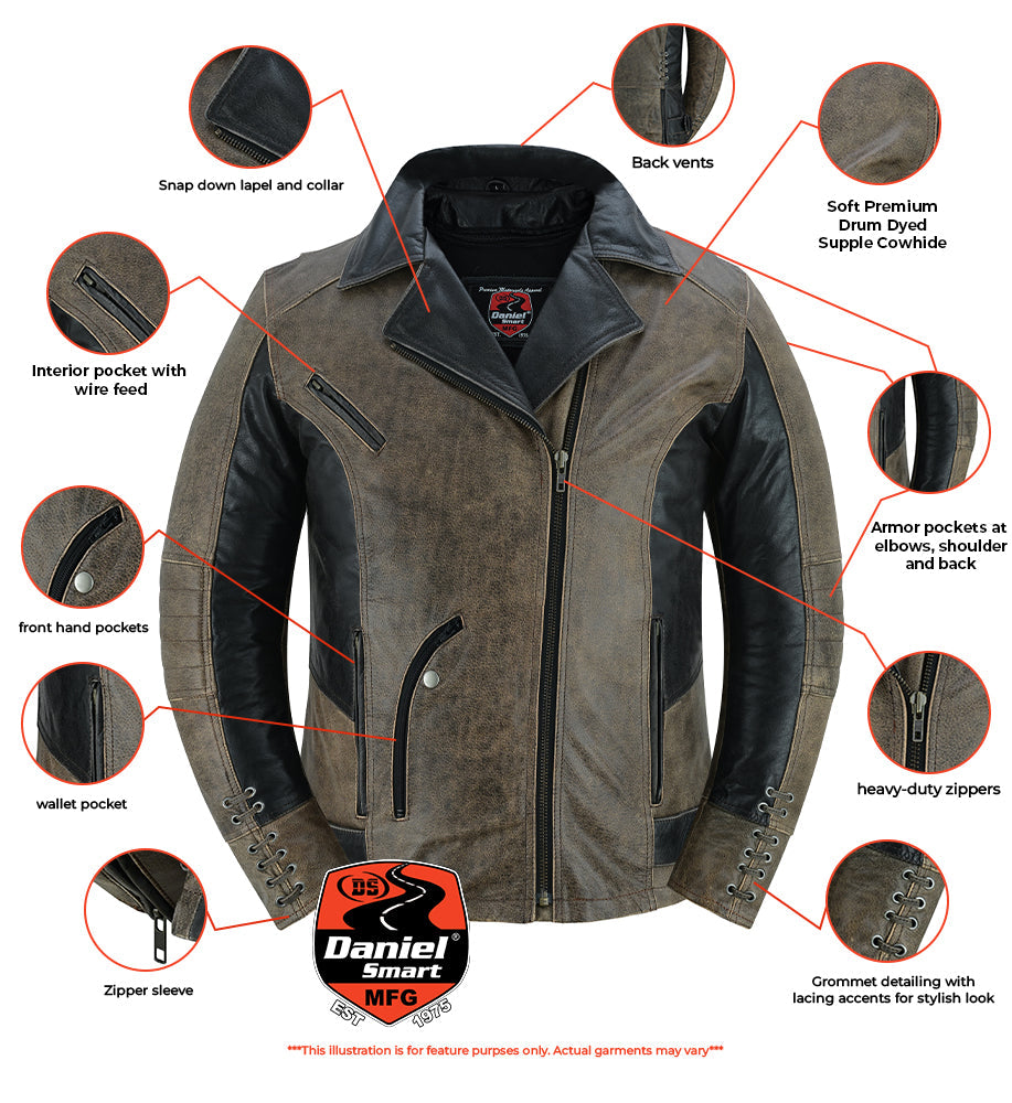 The Fusion Flow Women's Leather Jacket is made of soft superior drum dyed supple cowhide 1.1-1.2 mm. It features stylish grommet and the detailing of lacing accents and a snap-down lapel and collar add to the charm. A vented zipper chest pocket and two back vents promote airflow, allowing you to breathe comfortably regardless of the season. It has two front-hand pockets, one wallet pocket, and an inside pocket with a wire feed. With a modern fit, belted tabs, and reinforced shoulder support, it provides both comfort and secure storage. The zip-away heated liner, armor pockets, and heavy-duty zippers round off the design. The Wild Eclipse Women's Leather Jacket blends edgy style with all-season comfort. With lacing accents and vented airflow, its built for bold, fearless rides. Ride strong, stay stylish, and embrace the adventure!
