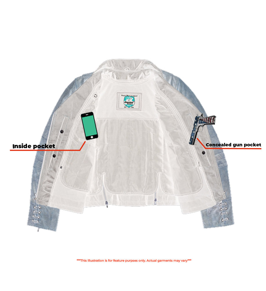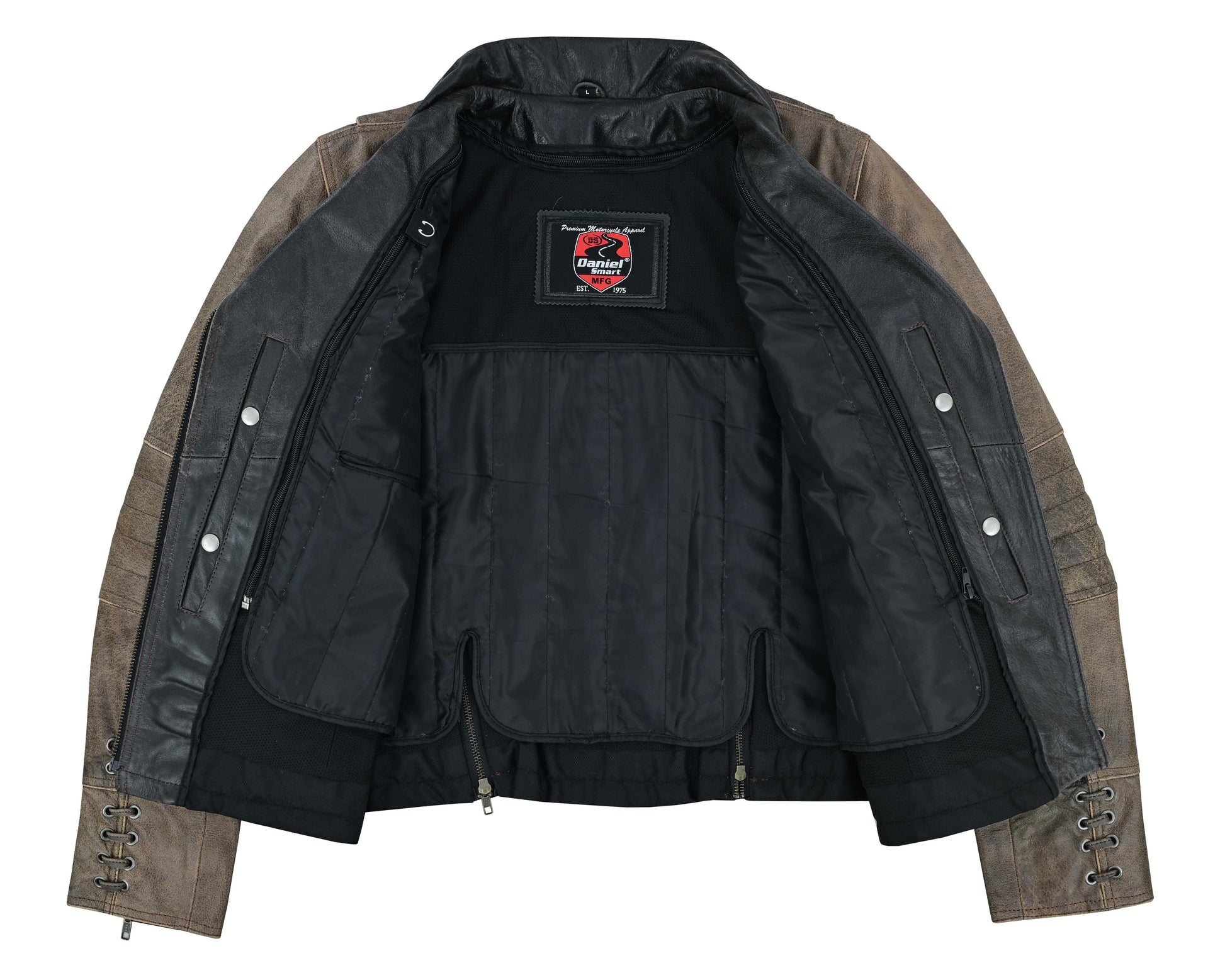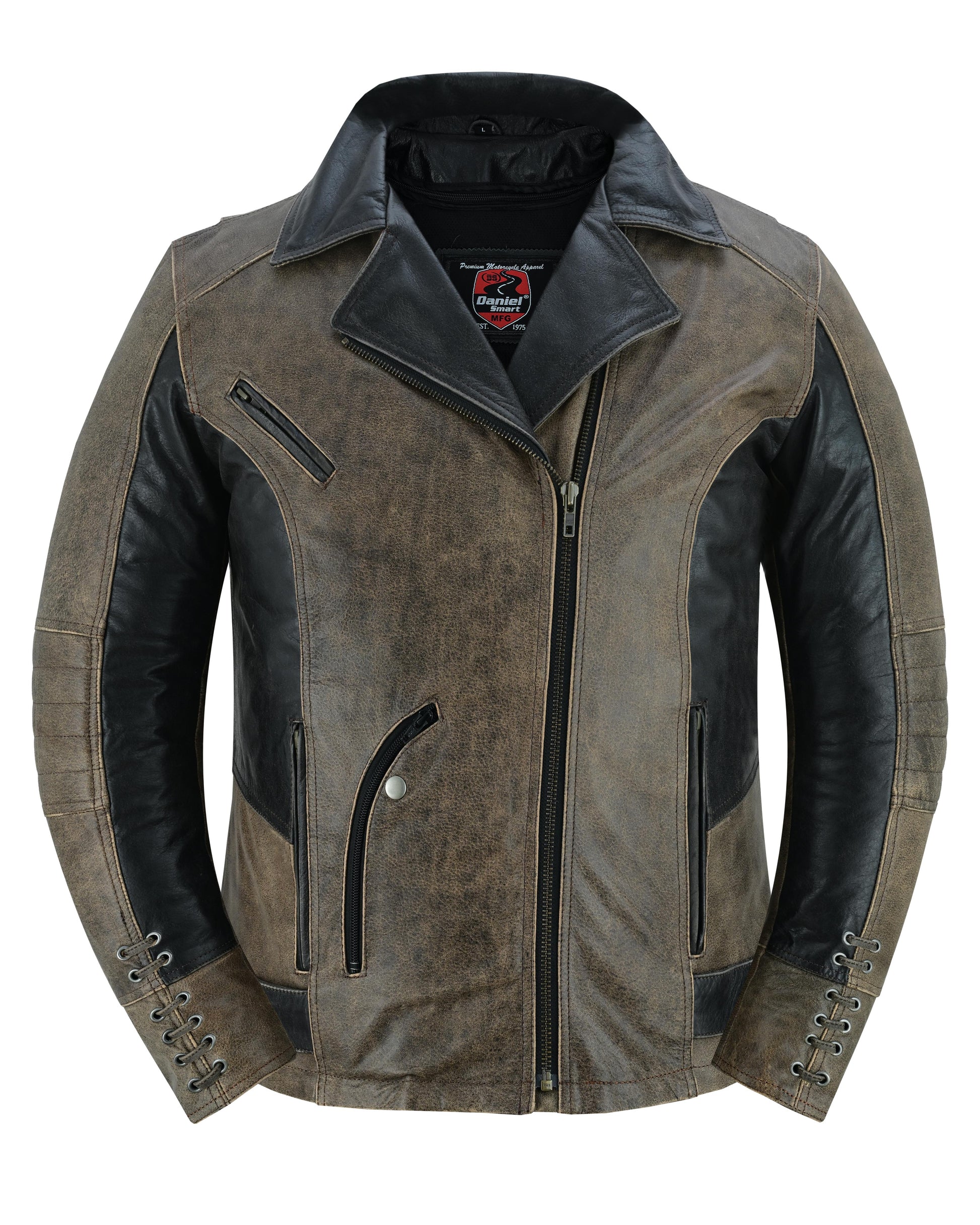 The Fusion Flow Women's Leather Jacket is made of soft superior drum dyed supple cowhide 1.1-1.2 mm. It features stylish grommet and the detailing of lacing accents and a snap-down lapel and collar add to the charm. A vented zipper chest pocket and two back vents promote airflow, allowing you to breathe comfortably regardless of the season. It has two front-hand pockets, one wallet pocket, and an inside pocket with a wire feed. With a modern fit, belted tabs, and reinforced shoulder support, it provides both comfort and secure storage. The zip-away heated liner, armor pockets, and heavy-duty zippers round off the design. The Wild Eclipse Women's Leather Jacket blends edgy style with all-season comfort. With lacing accents and vented airflow, its built for bold, fearless rides. Ride strong, stay stylish, and embrace the adventure!