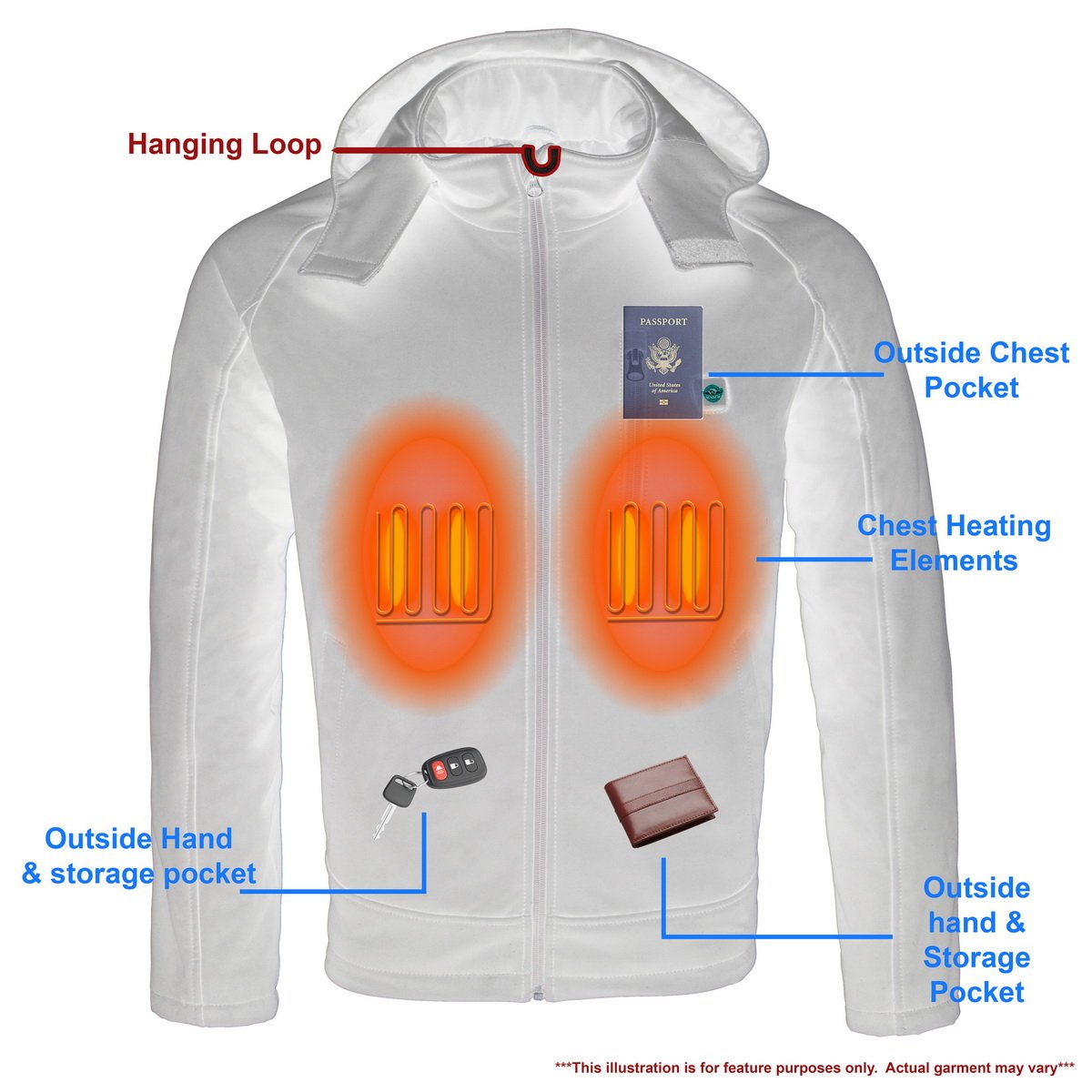 - Power-On Button on Chest (Led Lights Indicate Power is On or Off – Warming jacket Settings Red = High, White = Medium, Blue = Low)