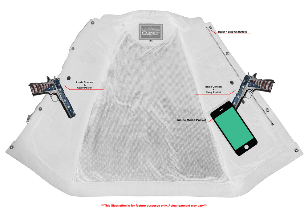 * 2 upgraded style concealed gun pockets between the snap and the zipper made of special heavy-duty textile with built-in holsters and snap closure.