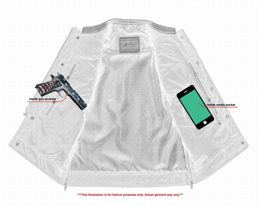2 upgraded style concealed gun pockets between the snap and the zipper made of special heavy-duty textile with built-in holsters and snap closure.